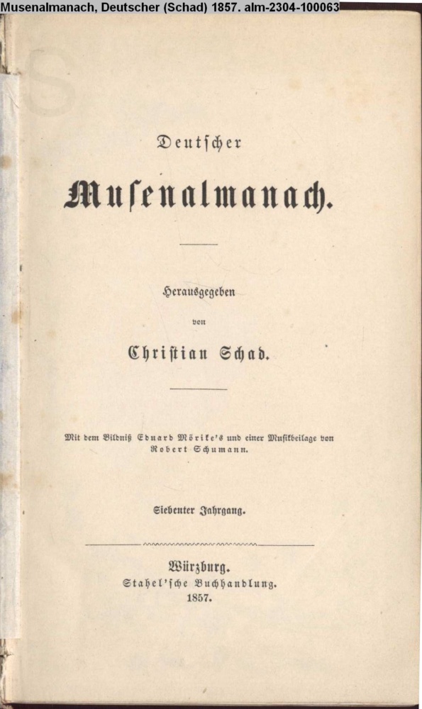 Deutscher / Musenalmanach. / Herausgegeben / von / Christian Schad. / Mit dem Bildniß Eduard Mörike's und einer Musikbeilage von / Robert Schumann. / Siebenter Jahrgang. / Würzburg. / Stahel'sche Buchhandlung. / 1857