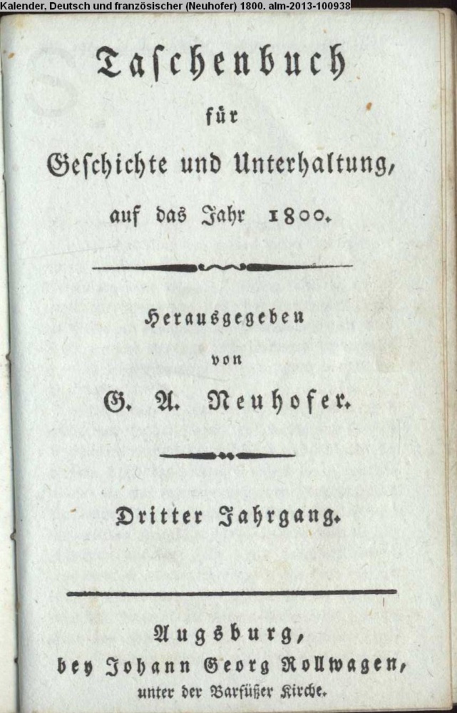 Taschenbuch / für / Geschichte und Unterhaltung, / auf das Jahr 1800. / Herausgegeben / von / G. A. Neuhofer. / Dritter Jahrgang. / Augsburg, / bey Johann Georg Rollwagen, / unter der Barfüßer Kirche