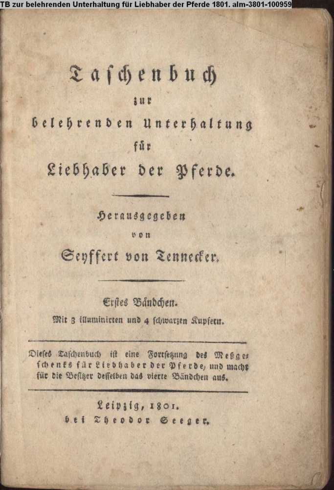 Taschenbuch / zur / belehrenden Unterhaltung / für / Liebhaber der Pferde. / Herausgegeben / von / Seyffert von Tennecker. / Erstes Bändchen. / Mit 3 illuminirten und 4 schwarzen Kupfern. / Dieses Taschenbuch ist eine Fortsetzung des Meßge- / schenks für Liebhaber der Pferde, und macht / für die Besitzer desselben das vierte Bändchen aus. / Leipzig, 1801. / bei Theodor Seeger