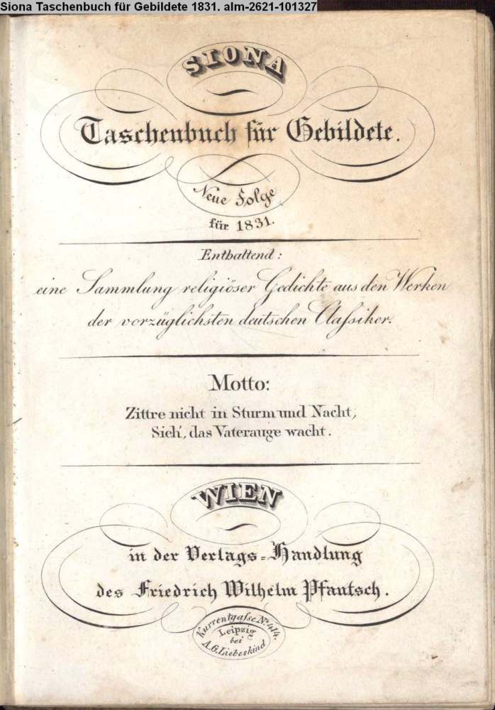 SIONA / Taschenbuch für Gebildete. / Neue Folge / für 1831. / Enthaltend: / eine Sammlung religiöser Gedichte aus den Werken / der vorzüglichsten deutschen Classiker. / Motto: / Zittre nicht in Sturm und Nacht, / Sieh' das Vaterauge wacht. / WIEN / in der Verlags-Handlung / des Friedrich Wilhelm Pfautsch. / Kurrentgasse No. 414. / Leipzig / bei / A. G. Liebeskind