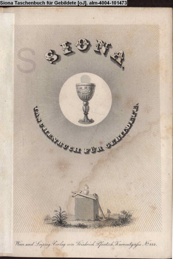 Siona. / Taschenbuch für Gebildete. / Vierter Jahrgang. / Enthaltend: / Religiöse Gedichte. / Mit Originalbeiträgen / von / F. Fitzinger, J. J. Hannusch, J. L. Huber, J. Langer, / M. Neumayer, F. Pfeffer, P. Renn, L. Schlecht, Joh. G. / Seidl, And. Schumacher, E. Straube, A. v. Tschabuschnigg, / Joh. N. Vogl, Hermann Waldow, Zeno, etc / nebst / einer Sammlung religiöser Gesänge, / aus den Werken der vorzüglichsten deutschen Classiker. / Wien u. Leipzig. / Verlag von Fried. Wilhelm Pfautsch. / Currentgasse Nr. 414