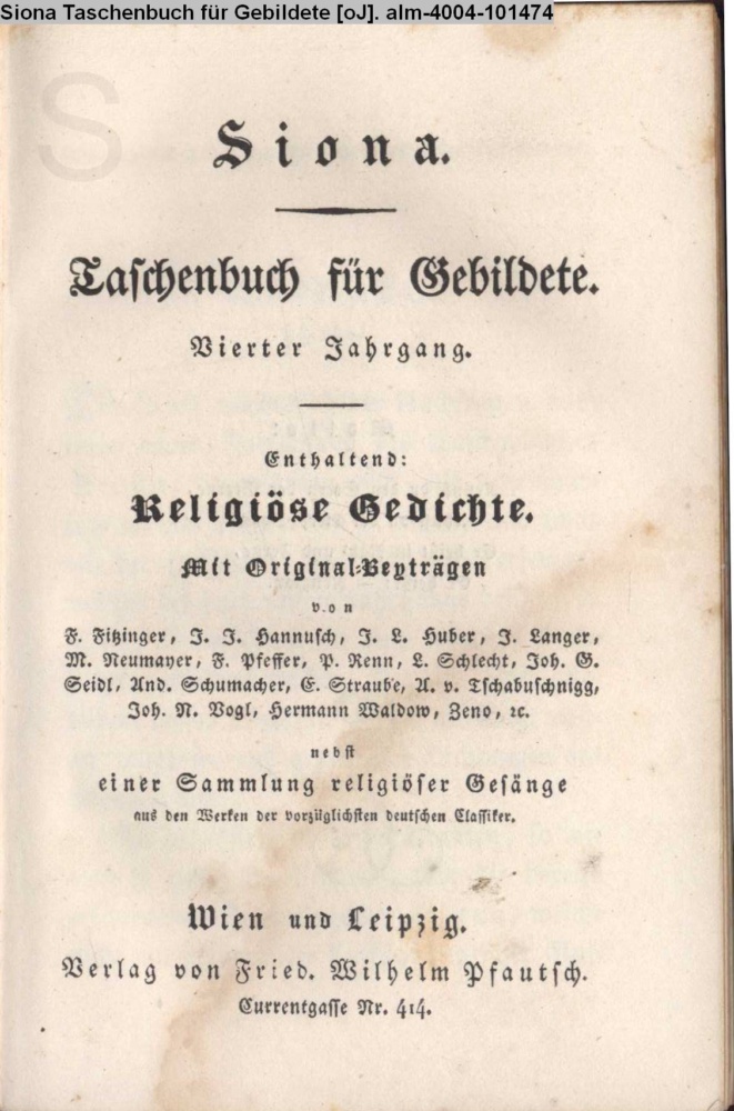 Siona. / Taschenbuch für Gebildete. / Vierter Jahrgang. / Enthaltend: / Religiöse Gedichte. / Mit Originalbeiträgen / von / F. Fitzinger, J. J. Hannusch, J. L. Huber, J. Langer, / M. Neumayer, F. Pfeffer, P. Renn, L. Schlecht, Joh. G. / Seidl, And. Schumacher, E. Straube, A. v. Tschabuschnigg, / Joh. N. Vogl, Hermann Waldow, Zeno, etc / nebst / einer Sammlung religiöser Gesänge, / aus den Werken der vorzüglichsten deutschen Classiker. / Wien u. Leipzig. / Verlag von Fried. Wilhelm Pfautsch. / Currentgasse Nr. 414