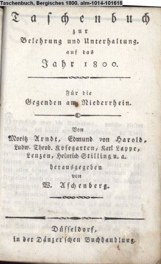 Taschenbuch / zur / Belehrung und Unterhaltung. / auf das / Jahr 1800. / Für die / Gegenden am Niederrhein. / Von / Moritz Arndt, Edmund von Harold, / Ludw. Theob. Kosegarten, Karl Lappe, / Leuzen, Heinrich Stilling u. a. / herausgegeben / von / W. Aschenberg. / Düsseldorf, / in der Dänzer'schen Buchhandlung