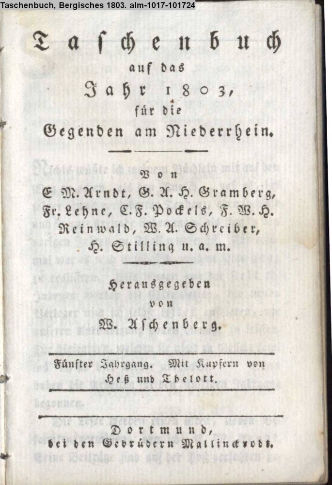 Taschenbuch / auf das / Jahr 1803, / für die / Gegenden am Niederrhein. / Von E. M. Arndt, G. A. H. Gramberg, / Fr. Lehne, C. F. Pockels, F. W. H. / Reinwald, W. A. Schreiber, / H. Stilling u. a. m. / Herausgegeben / von / W. Ascheberg. / Fünfter Jahrgang. Mit Kupfern von / Heß und Thelott. / Dortmund, / bei den Gebrüdern Mallinckrodt