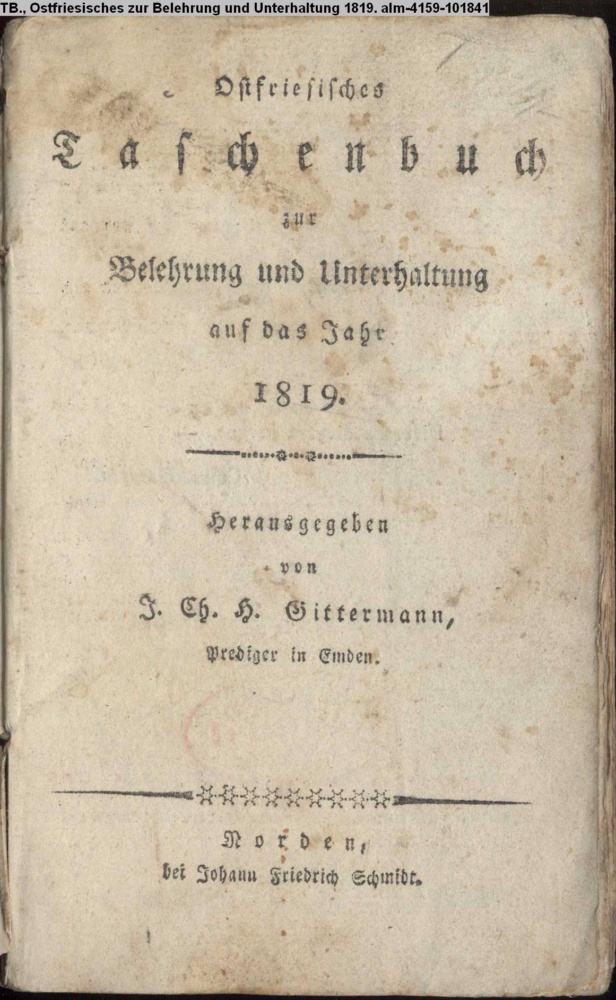 Ostfriesisches / Taschenbuch / zur / Belehrung und Unterhaltung / auf das Jahr / 1819. / Herausgegeben / von / J. Ch. H. Gittermann, / Prediger in Emden. / Norden, / bei Johann Friedrich Schmidt