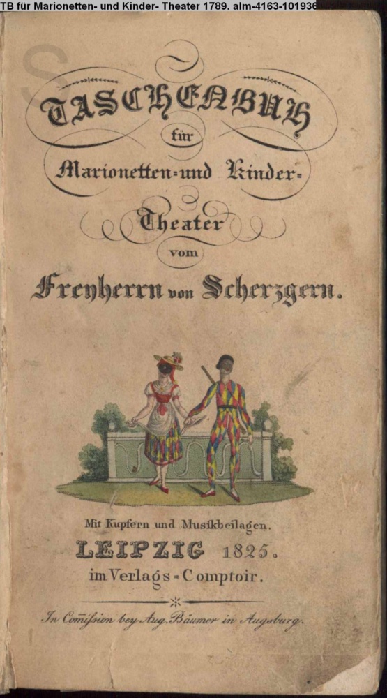 TASCHENBUCH / für / Marionetten- und Kinder- / Theater / vom / Freyherrn von Scherzgern. / Mit Kupfern und Musikbeilagen. / LEIPZIG 1825. / im Verlags-Comptoir. / In Commission bey Aug. Bäumer in Augsburg