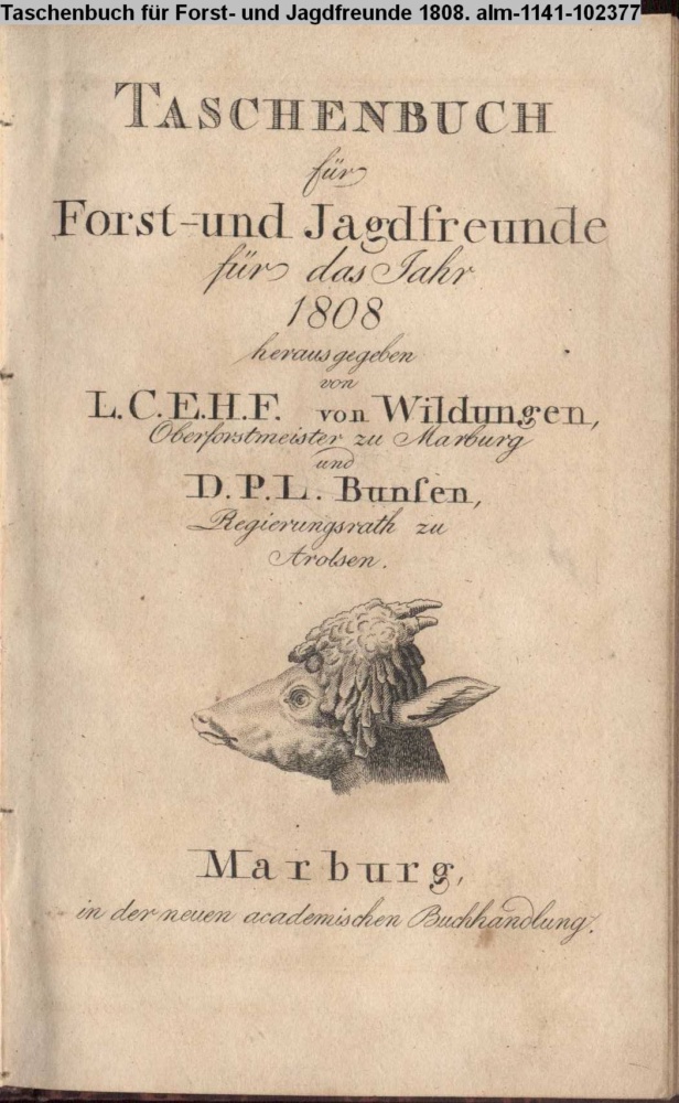 TASCHENBUCH / für / Forst- und Jagdfreunde / für das Jahr / 1808 / herausgegeben / von / L. C. E. H. F. von Wildungen, / Oberforstmeister zu Marburg / D. P. L. Bunsen, / Regierungsrath zu / Arolsen. / Marburg, / in der neuen academischen Buchhandlung