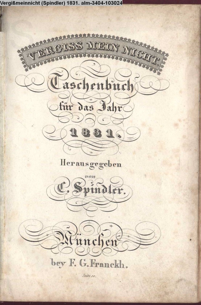 VERGISS MEIN NICHT. / Taschenbuch / für das Jahr / 1831. / Herausgegeben / von / C. Spindler. / MÜNCHEN / bey / F. G. Franckh