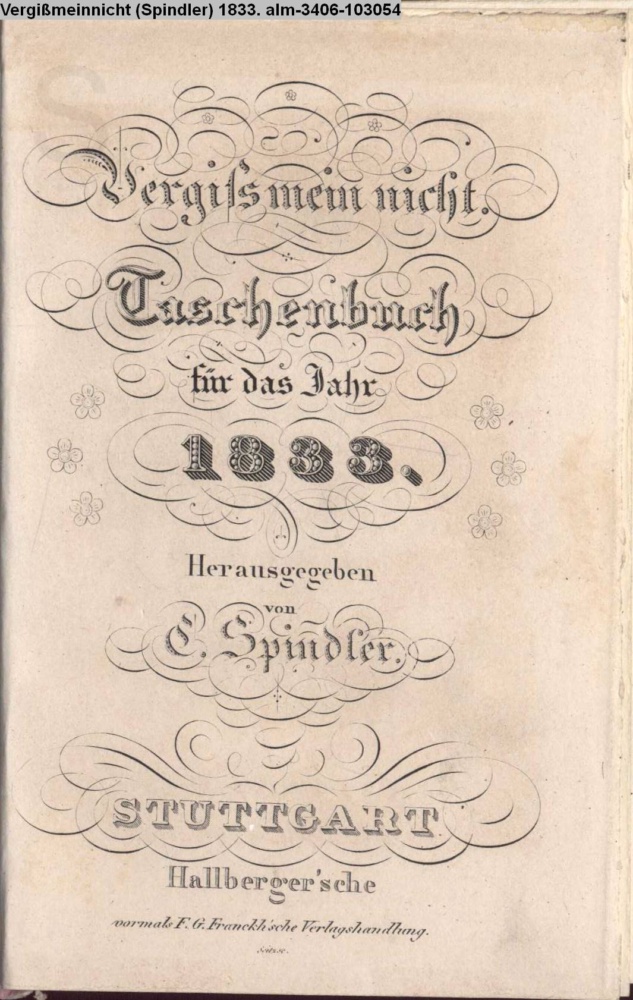Vergiss mein nicht. / Taschenbuch / für das Jahr / 1833. / Herausgegeben / von / C. Spindler. / STUTTGART / Hallberger'sche / vormals F. G. Franckh'sche Verlagshandlung