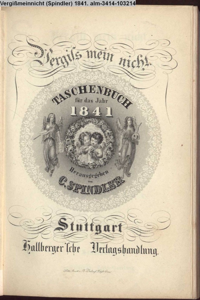 Vergiß mein nicht. / Taschenbuch für das Jahr 1841. / Zwölfter Jahrgang. / Herausgegeben / von / C. Spindler. / Stuttgart. / Halberger'sche Verlagshandlung