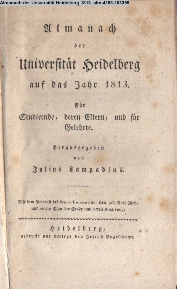 Almanach / der / Universität Heidelberg / auf das Jahr 1813. / Für / Studirende, deren Eltern, und für / Gelehrte. / Herausgegeben / von / Julius Lampadius. / Mit dem Portrait des Senior Universitatis, Hrn. geh. Rath Mai, / und einem Plan der Stadt und deren Umgebung. / Heidelberg, / gedruckt und verlegt bey Joseph Engelmann