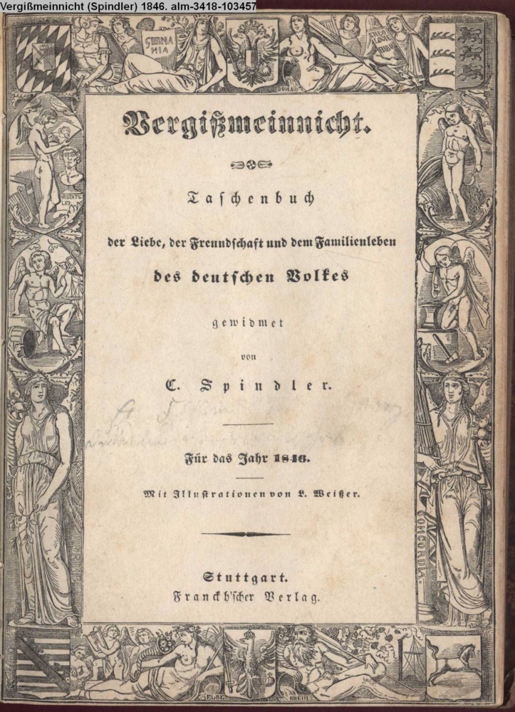 Vergißmeinnicht. / Taschenbuch / der Liebe, der Freundschaft und dem Familienleben / des deutschen Volkes / gewidmet / von / C. Spindler. / Für das Jahr 1846. / Mit Illustrationen von L. Weißer. / Stuttgart. / Franckh'scher Verlag