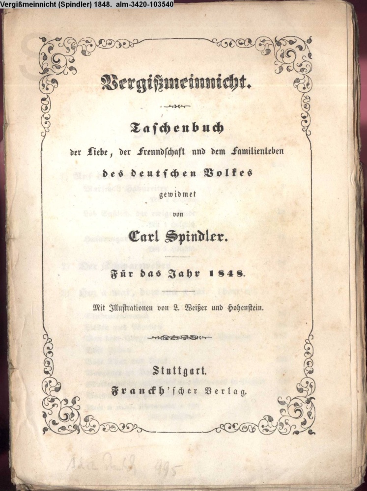 Vergißmeinnicht. / Taschenbuch / der Liebe, der Freundschaft und dem Familienleben / des deutschen Volkes / gewidmet / von / Carl Spindler. / Für das Jahr 1848. / Mit Illustrationen von L. Weißer / und Hohenstein. / Stuttgart. / Franckh'scher Verlag