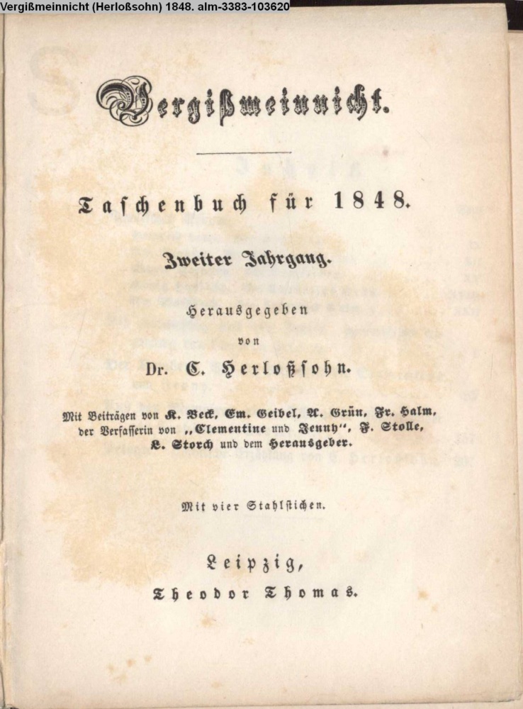 Vergißmeinnicht. / Taschenbuch für 1848. / Zweiter Jahrgang. / Herausgegeben / von / Dr. C. Herloßsohn. / Mit Beiträgen von K. Beck, Em. Geibel, A. Grün, Fr. Halm, / der Verfasserin von »Clementine und Jenny«, F. Stolle, / L. Storch und dem Herausgeber. / Mit vier Stahlstichen. / Leipzig, / Theodor Thomas