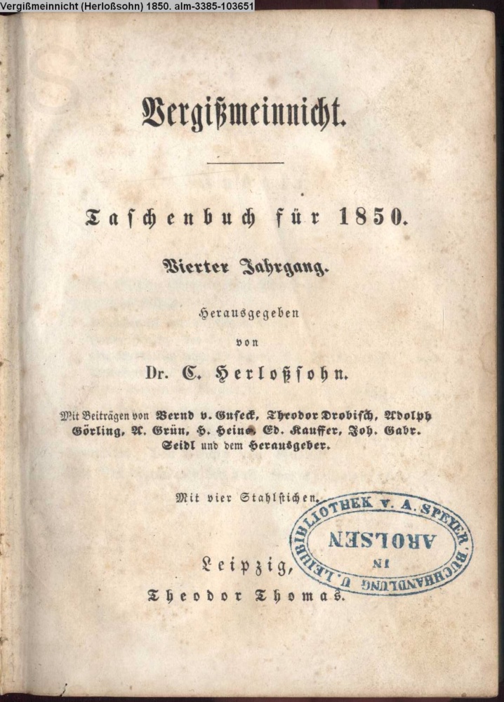 Vergißmeinnicht. / Taschenbuch für 1850. / Vierter Jahrgang. / Herausgegeben / von / Dr. C. Herloßsohn. / Mit Beiträgen von Bernd v. Guseck, Theodor Drobisch, Adolph / Görling, A. Grün, H. Heine, Ed. Kauffer, Joh. Gabr. / Seidl und dem Herausgeber. / Mit vier Stahlstichen. / Leipzig, / Theodor Thomas