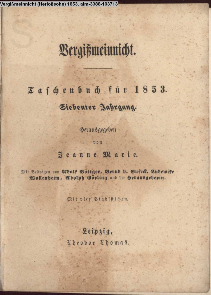 Vergißmeinnicht. / Taschenbuch für 1853. / Siebenter Jahrgang. / Herausgegeben / von / Jeanne Marie. / Mit Beiträgen von Adolf Böttger, Bernd v. Guseck, Ludewike / Wallenheim, Adolf Görling und der Herausgeberin etc / Mit vier Stahlstichen. / Leipzig, / Theodor Thomas