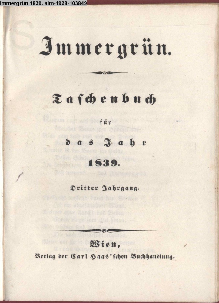 Immergrün. / Taschenbuch / für / das Jahr / 1839. / Dritter Jahrgang. / Wien, / Verlag der Carl Haas'schen Buchhandlung
