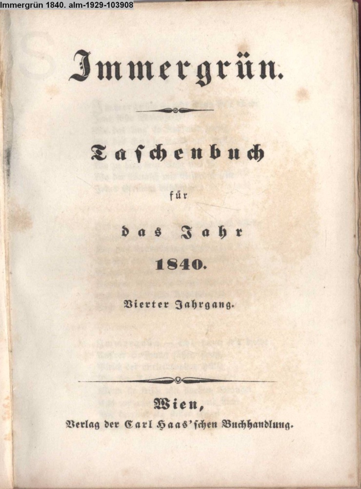 Immergrün. / Taschenbuch / für / das Jahr 1840. / Vierter Jahrgang. / Wien. / Verlag der Carl Haas'schen Buchhandlung