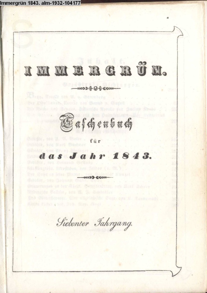 IMMERGRÜN / Taschenbuch / für / das Jahr 1843. / Siebenter Jahrgang