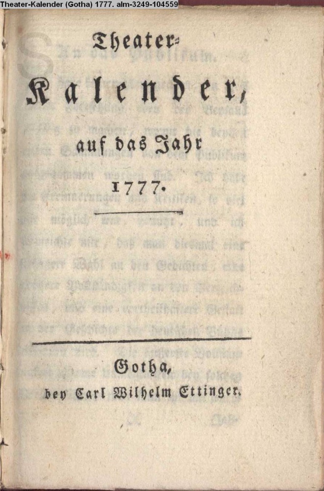 Theater- / Kalender, / auf das Jahr / 1777. / Gotha / bey Carl Wilhelm Ettinger
