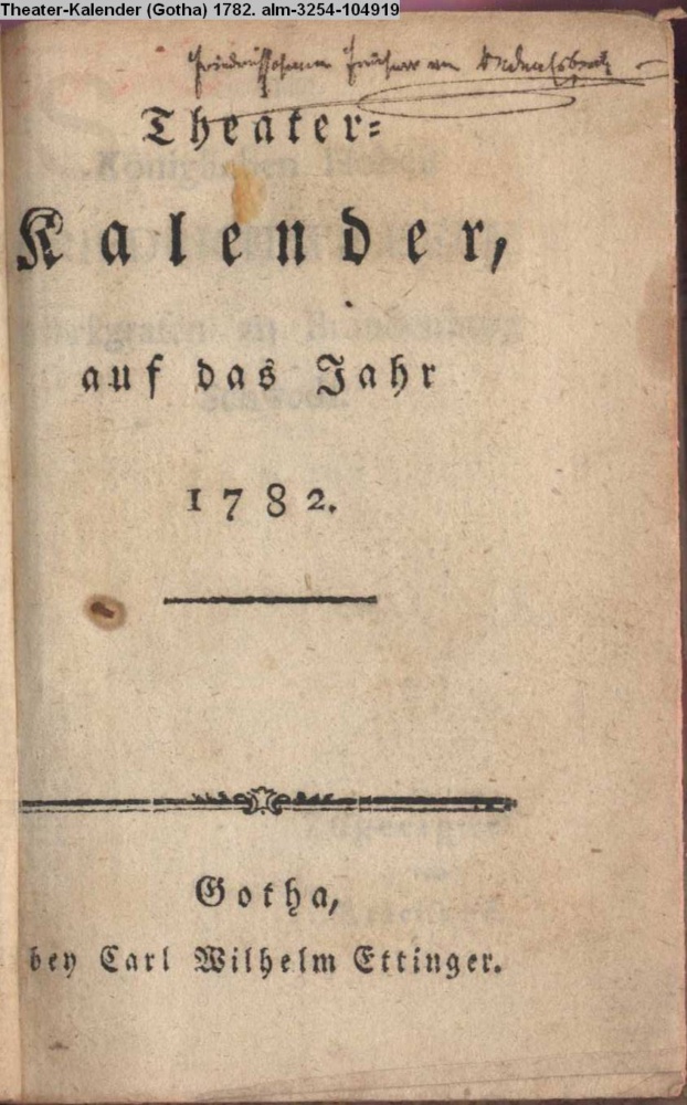 Theater- / Kalender, / auf das Jahr / 1782. / Gotha, / bey Carl Wilhelm Ettinger