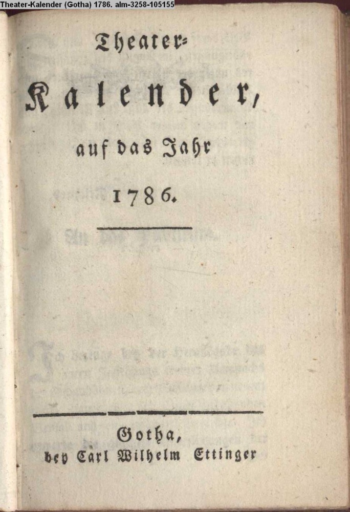 Theater- / Kalender, / auf das Jahr / 1786. / Gotha, / bey Carl Wilhelm Ettinger