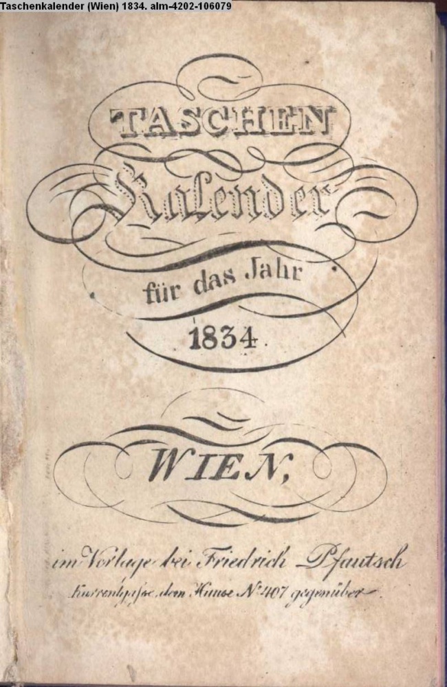 TASCHEN / KALENDER / für das Jahr / 1834. / WIEN, / im Verlage bei Friedrich Pfautsch / Kurrentgasse, dem Hause No. 407 gegenüber