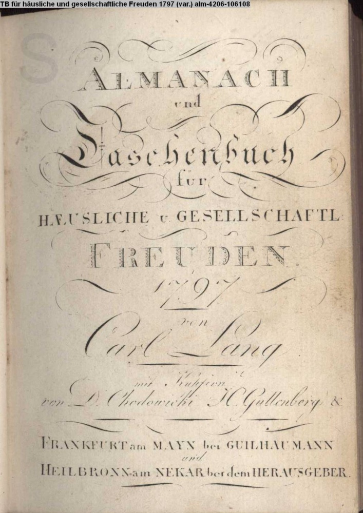 ALMANACH / und / Taschenbuch / für / HAEUSLICHE / u. GESELLSCHAFTL. / FREUDEN. / 1797. / von / Carl Lang. / mit Kupfern / von D. Chodowiecki, H. Guttenberg & / FRANKFURT am MAYN bei GUILHAUMANN / HEILBRONN am NEKAR bei dem HERAUSGEBER