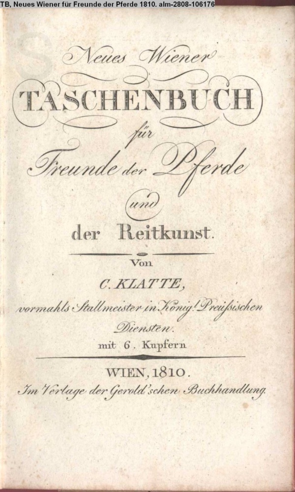 Neues Wiener / TASCHENBUCH / für / Freunde der Pferde / und / der Reitkunst. / von C. KLATTE, / vormahls Stallmeister in Königl. Preussischen / Diensten. / mit 6 Kupfern / WIEN, 1810. / Im Verlage der Gerold'schen Buchhandlung