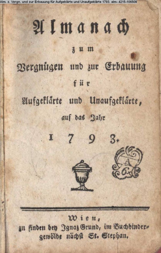 Almanach / zum / Vergnügen und zur Erbauung / für Aufgeklärte und Unaufgeklärte / auf das Jahr / 1793. / Wien, / zu finden bey Ignaz Grund im Buchbinder- / gewölbe nächst St. Stephan