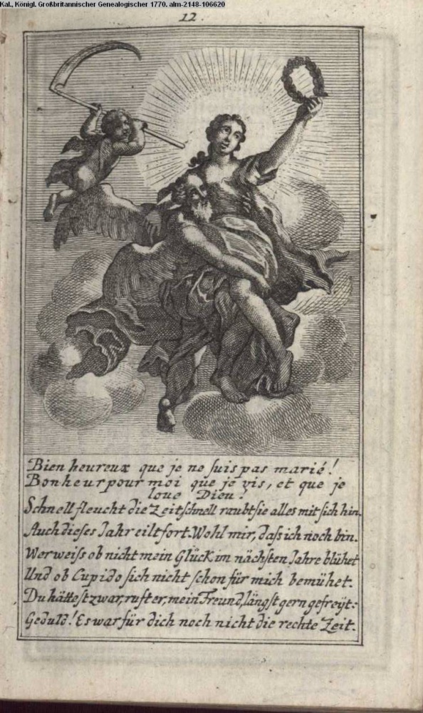 Bien heureux que je ne suis pas marié! / Bonheur pour moi que je vis, et que je / loue Dieu! / Schnell fleucht die Zeit, schnell raubt sie alles mit sich hin