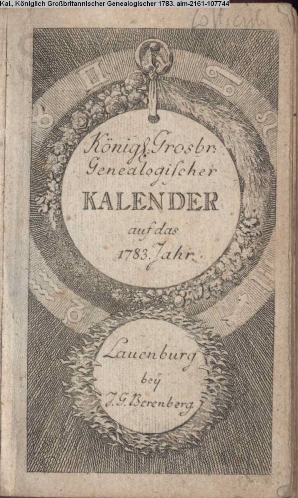 Königl. Grosbr. / Genealogischer / KALENDER / auf das / 1783. Jahr. / Lauenburg / bey / J. G. Berenberg