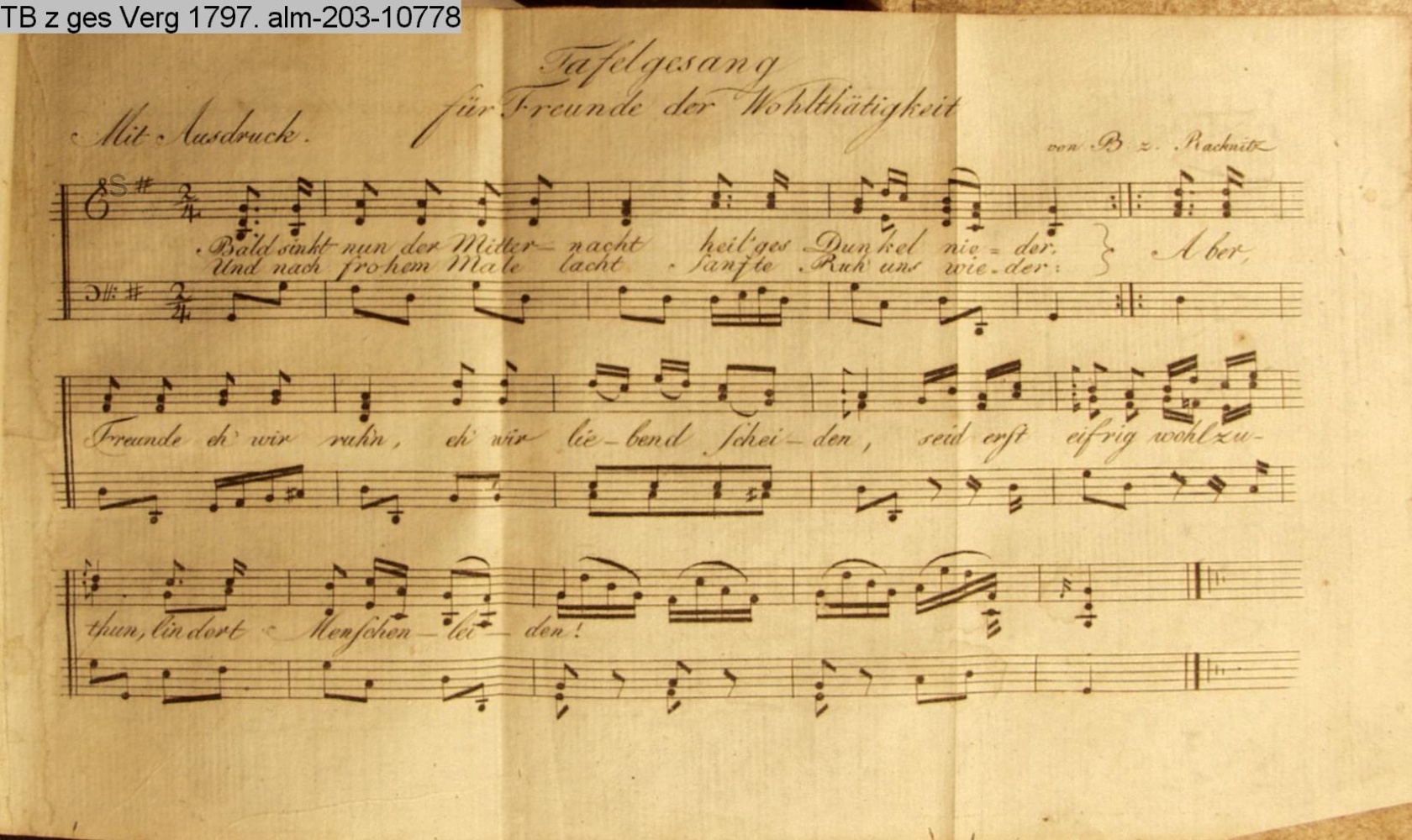 80. / Tafelgesang für Freunde der / Wohlthätigkeit. / Die Compos. ist vom Freiherrn zu Racknitz