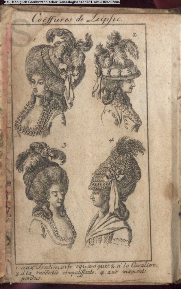 Coëffures de Leipsic / 1. aux Sentiments equivoques. 2. à la Cavaliere. / 3. à la modestie compatissante. / 4. aux monments perdus