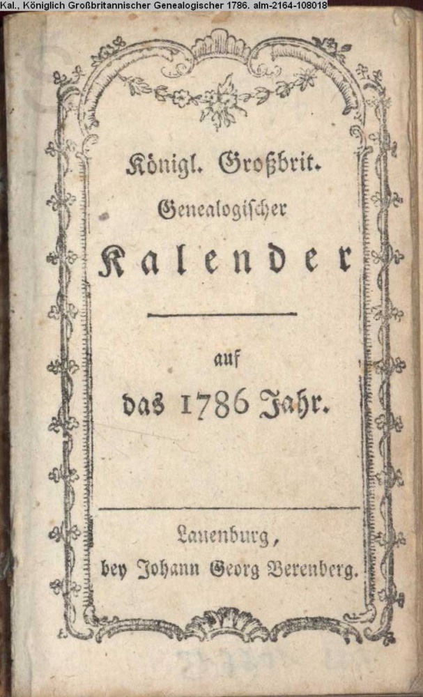 Königl. Großbrit. / Genealogischer / Kalender / auf / das 1786 Jahr. / Lauenburg, / bey Johann Georg Berenberg