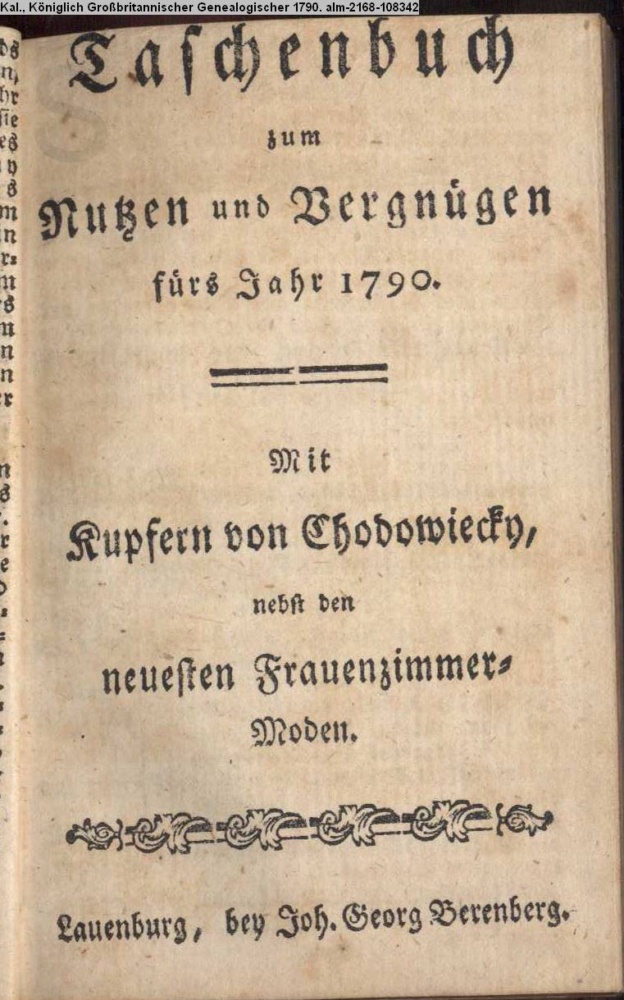 Taschenbuch / zum / Nutzen und Vergnügen / fürs Jahr 1790. / Mit / Kupfern von Chodowiecky, / nebst den / neuesten Frauenzimmer- / Moden. / Lauenburg, bey Joh. Georg Berenberg