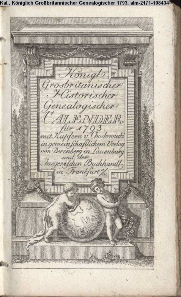 Königl / Grosbritanischer / Historischer / Genealogischer / CALENDER / für / 1793. / mit Kupfern v. Chodowiecki / in gemeinschaftlichem Verlag / von Berenberg in Lauenburg / und der / Jaegerischen Buchhandl. / in Frankfurt / a/M