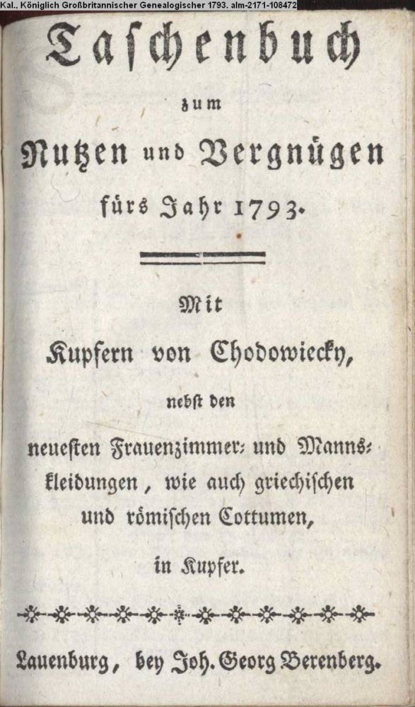 Taschenbuch / zum / Nutzen und Vergnügen / fürs Jahr 1793. / Mit / Kupfern von Chodowiecky, / nebst den / neuesten Frauenzimmer- und Manns- / kleidungen, wie auch griechischen / und römischen Cottumen, / in Kupfer. / Lauenburg, bey Joh. Georg Berenberg