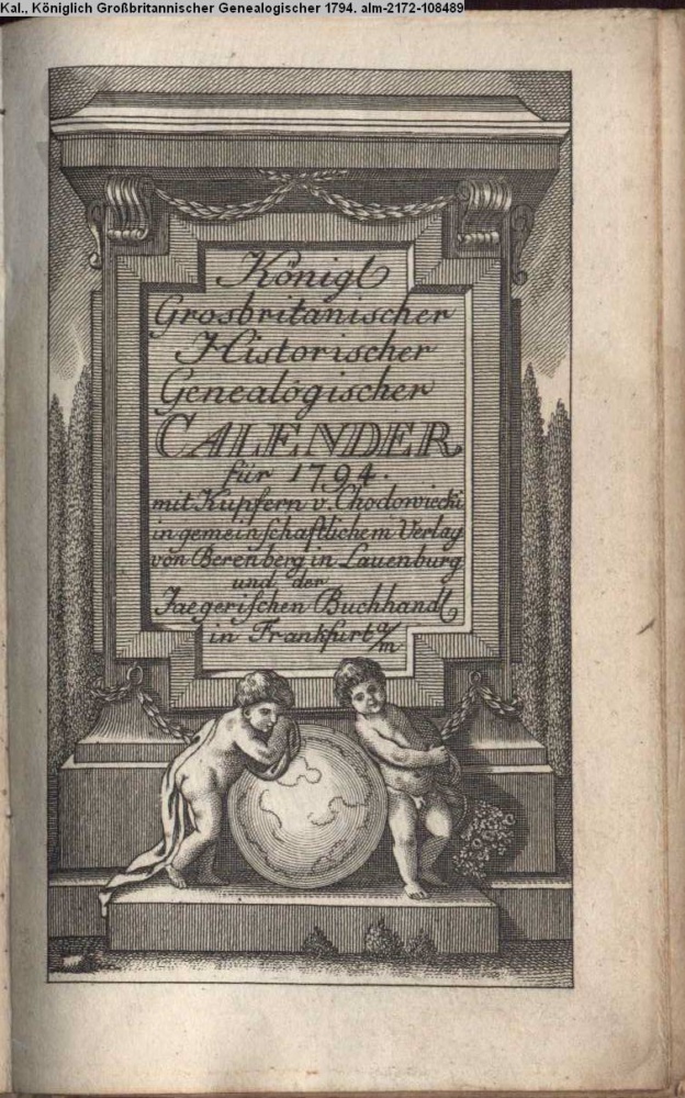 Königl / Grosbritanischer / Historischer / Genealogischer / CALENDER / für / 1794. / mit Kupfern v. Chodowiecki / in gemeinschaftlichem Verlag / von Berenberg in Lauenburg / und der / Jaegerischen Buchhandl. / in Frankfurt / a/m