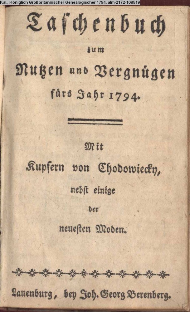 Taschenbuch / zum / Nutzen und Vergnügen / fürs Jahr 1794. / Mit Kupfern von Chodowiecky, / nebst einige / der / neuesten Moden. / Lauenburg, bey Joh. Georg Berenberg