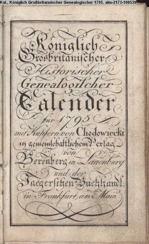 Königlich / Grosbritanischer / Historischer / Genealogischer / Calender / für 1795 / mit Kupfern von Chodowiecki / in gemeinschaftlichem Verlag / von Berenberg in Lauenburg / und der / Jaegerschen Buchhandl. / in Frankfurt am Main