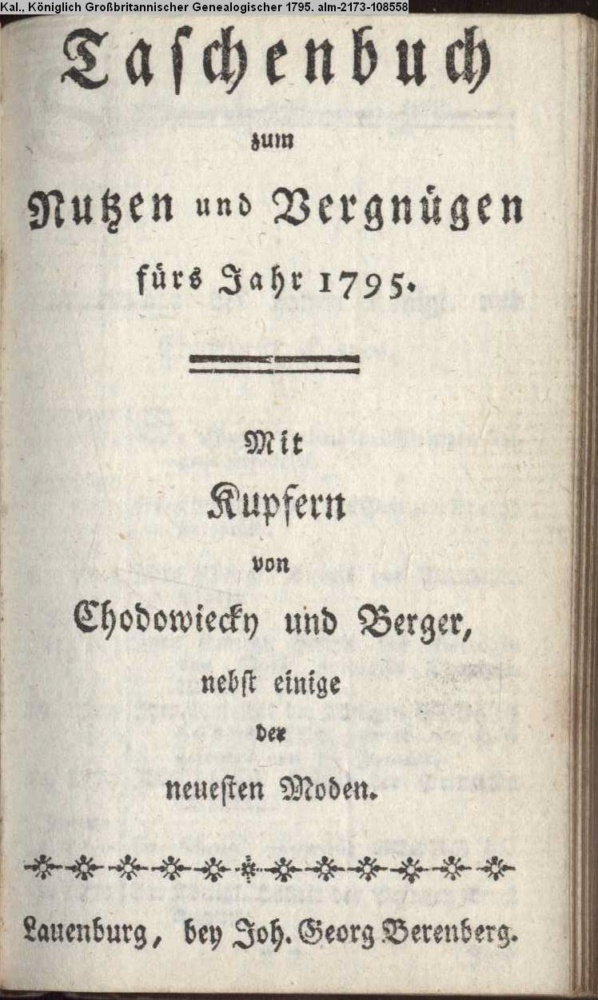 Taschenbuch / zum / Nutzen und Vergnügen / fürs Jahr 1795. / Mit Kupfern von Chodowiecky und Berger, / nebst einige / der / neuesten Moden. / Lauenburg, bey Joh. Georg Berenberg