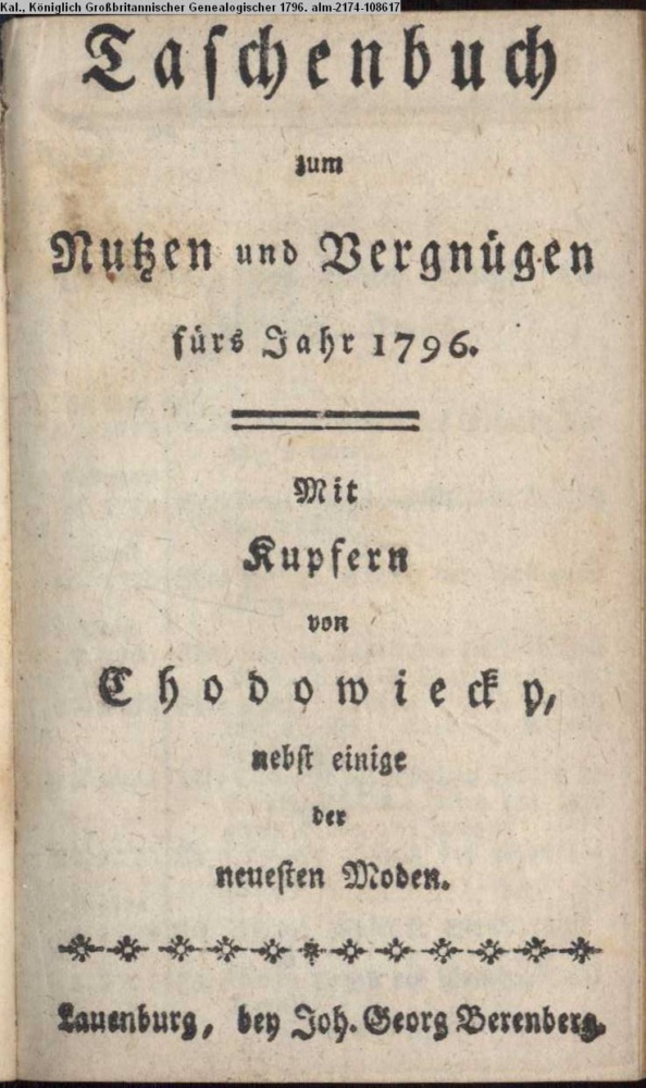Taschenbuch / zum / Nutzen und Vergnügen / fürs Jahr 1796. / Mit / Kupfern / von / Chodowiecky, / nebst einige / der / neuesten Moden. / Lauenburg, bey Joh. Georg Berenberg