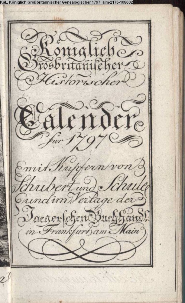 Königlich / Grosbritannischer / Historischer / Calender / für 1797 / mit Kupfern von / Schubert und Schule / und im Verlage der / Jaegerschen Buchhandlung / in Frankfurt am Main