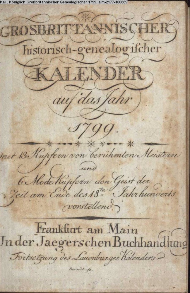 GROSBRITTANNISCHER / historisch-genealogischer / KALENDER / auf das Jahr / 1799. / Mit 13 Kupfern von berühmten Meistern / und / 6 Modekupfern den Geist der / Zeit am Ende des 18ten Jahrhunderts / vorstellend / Frankfurt am Main / In der Jaegerschen Buchhandlung / Fortsetzung des Lauenburger Kalenders
