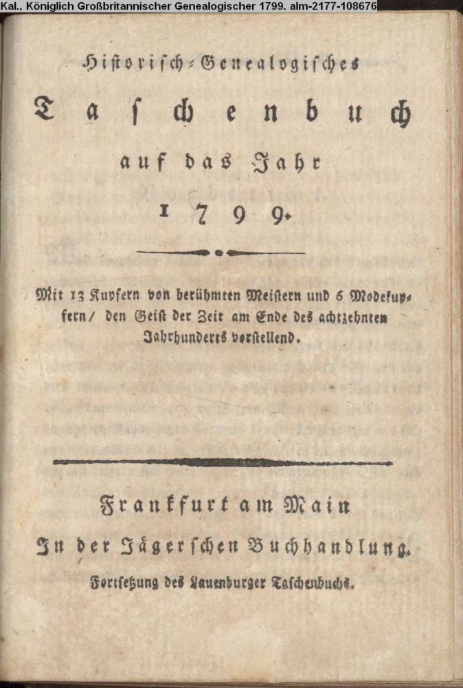 Historisch-Genealogisches / Taschenbuch / auf das Jahr 1799. / Mit 13 Kupfern von berühmten Meistern / und / 6 Modekup- / fern den Geist der Zeit am Ende des achtzehnten / Jahrhunderts / vorstellend. / Frankfurt am Main / In der Jaegerschen Buchhandlung / Fortsetzung des Lauenburger Taschenbuchs