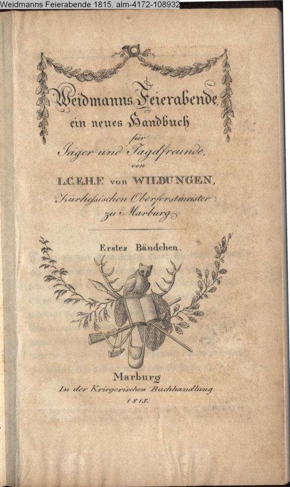 Weidmanns Feierabende, / ein neues Handbuch / für / Jäger und Jagdfreunde, / von / L. C. E. H. F. von WILDUNGEN, / Kurhessischen Oberforstmeister / zu Marburg. / Erstes Bändchen / Marburg / In der Kriegerischen Buchhandlung. / 1815