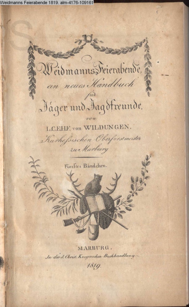 Weidmanns Feierabende, / ein neues Handbuch / für / Jäger und Jagdfreunde, / von / L. C. E. H. F. von WILDUNGEN. / Kurhessischen Oberforstmeister / zu Marburg / Fünftes Bändchen. / MARBURG. / In der J. Christ. Kriegerschen Buchhandlung. / 1819