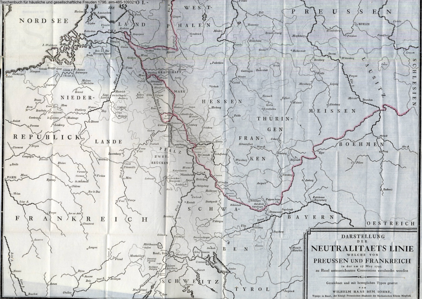 DARSTELLUNG / DER / NEUTRALITÄTS LINIE / WELCHE VON / PREUSSEN UND FRANKREICH / in der am 17 May 1795 / zu Basel unterzeichneten Convention verabredet worden. / Gezeichnet und mit beweglichen Typen gesetzt von / WILHELM HAAS DEM SOHNE, / Typogr. in Basel, der Königl. Preussischen Akademie der mechanischen Künste Mitglied