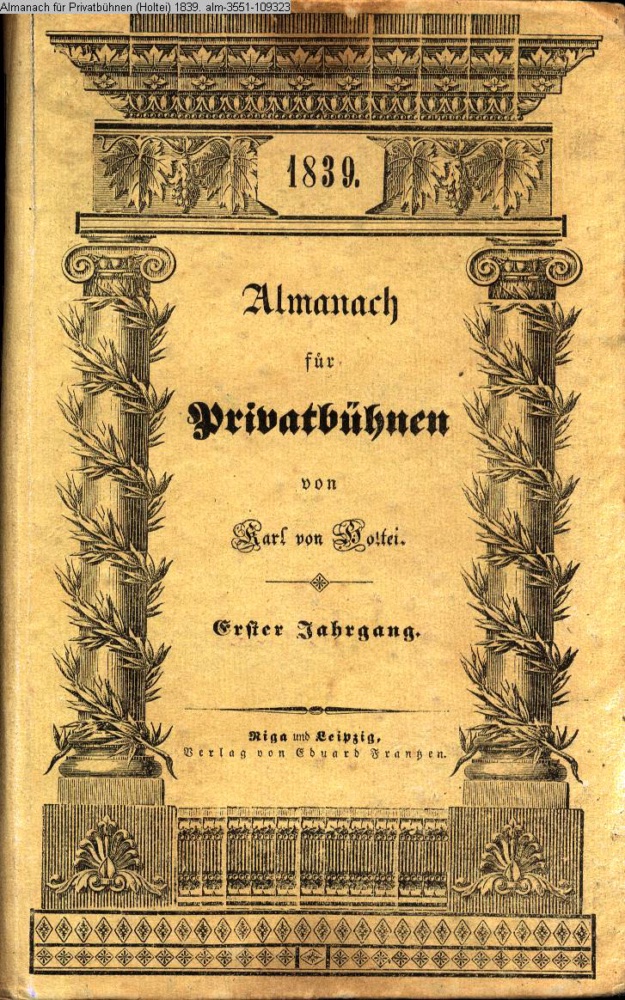 1839. / Almanach / für / Privat-Bühnen / von / Karl von Holtei. / Erster Jahrgang. / Riga und Leipzig. / Verlag von Eduard Frantzen
